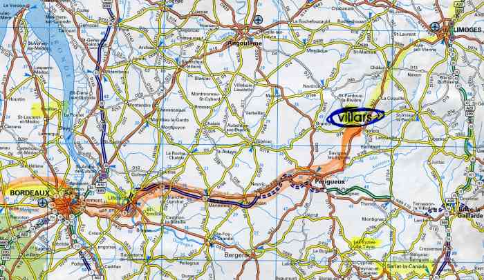 Map showing Villars, and the surrounding area. Airports at Limoges, Angouleme and Bordeaux.